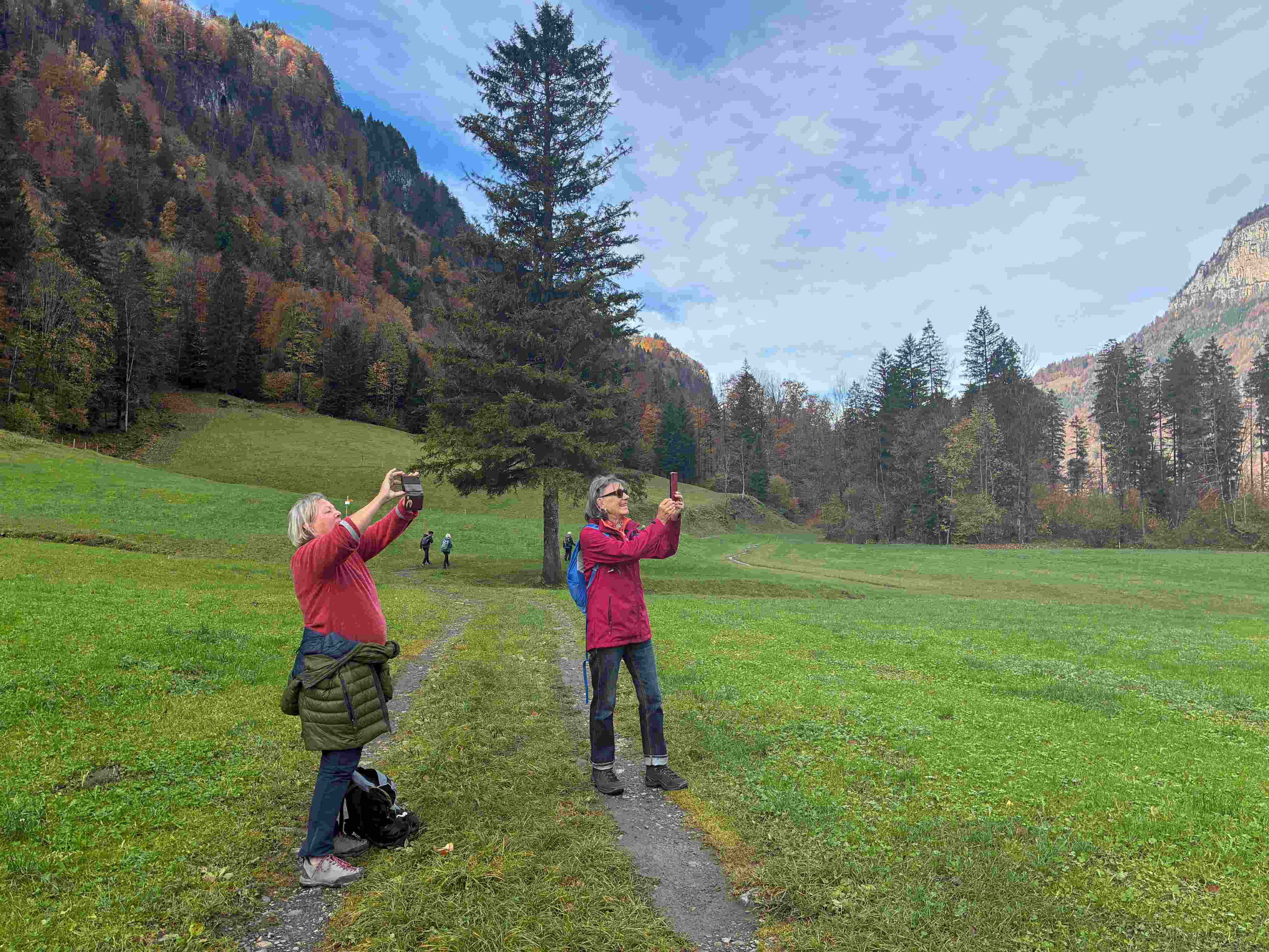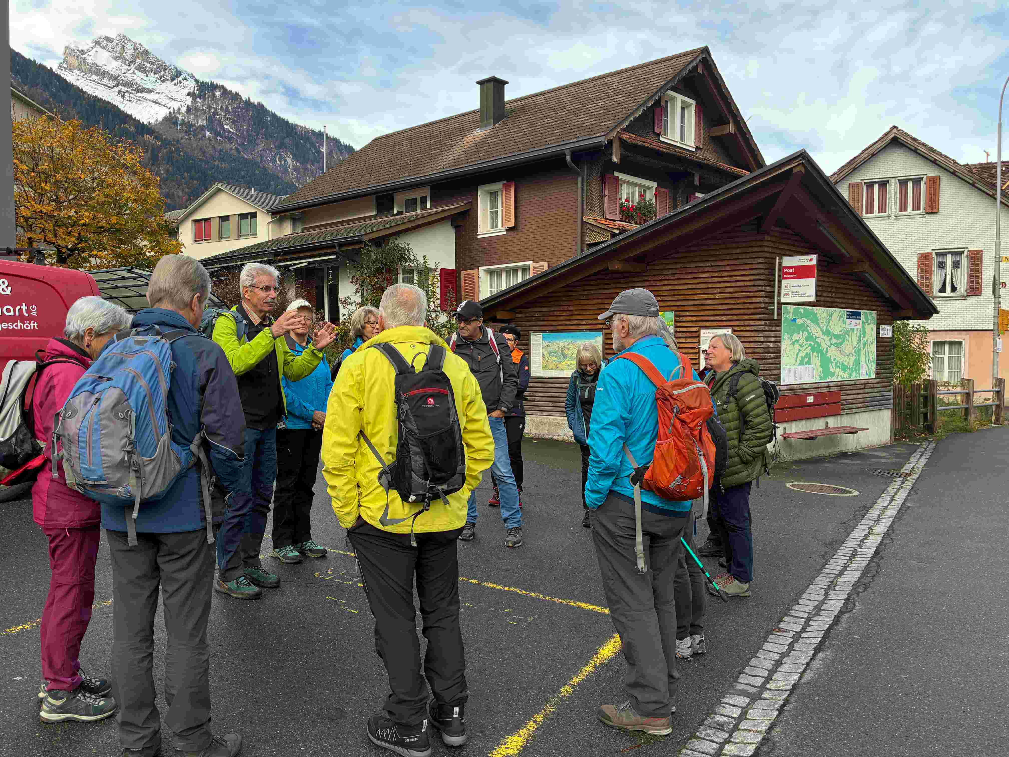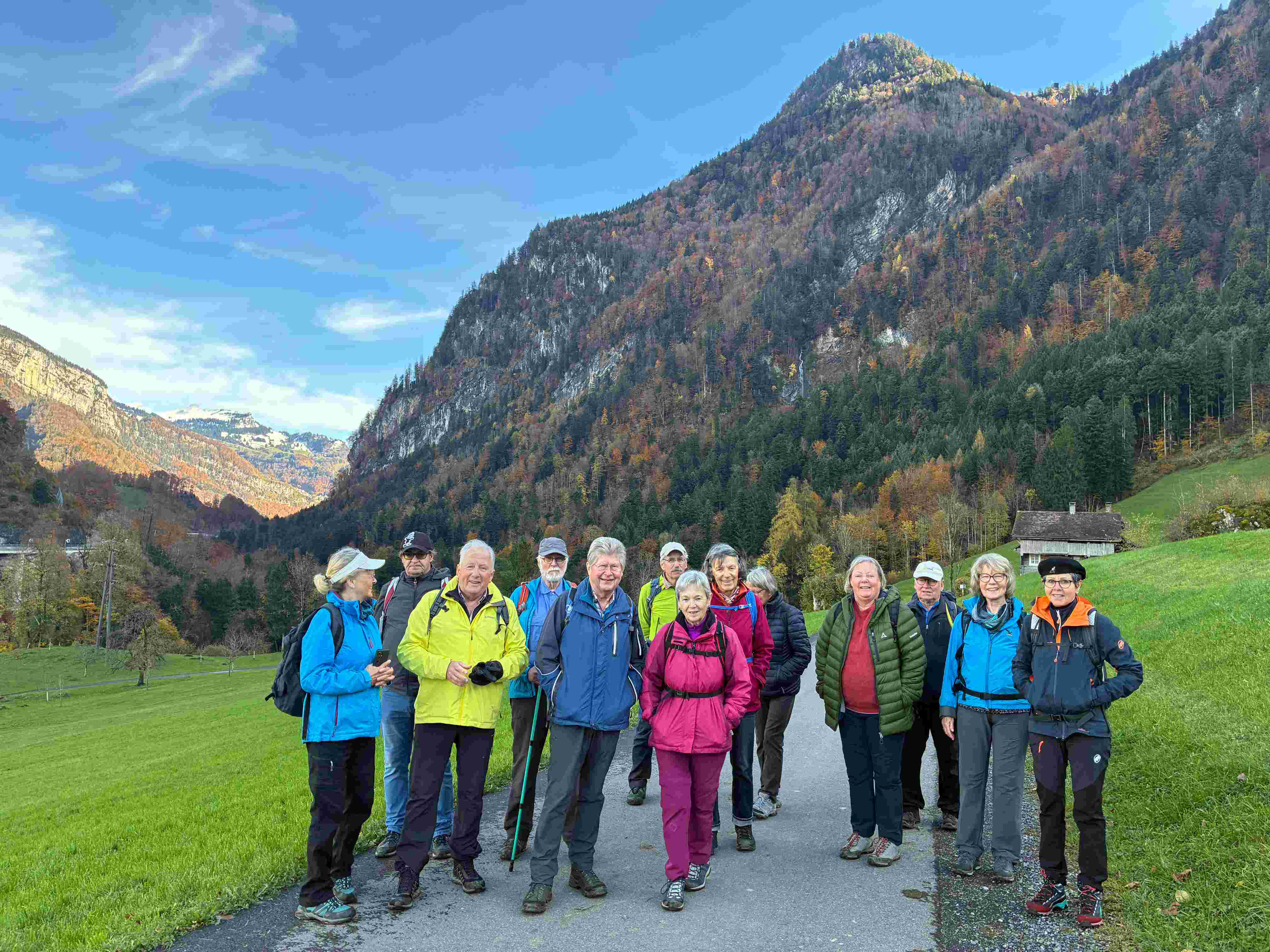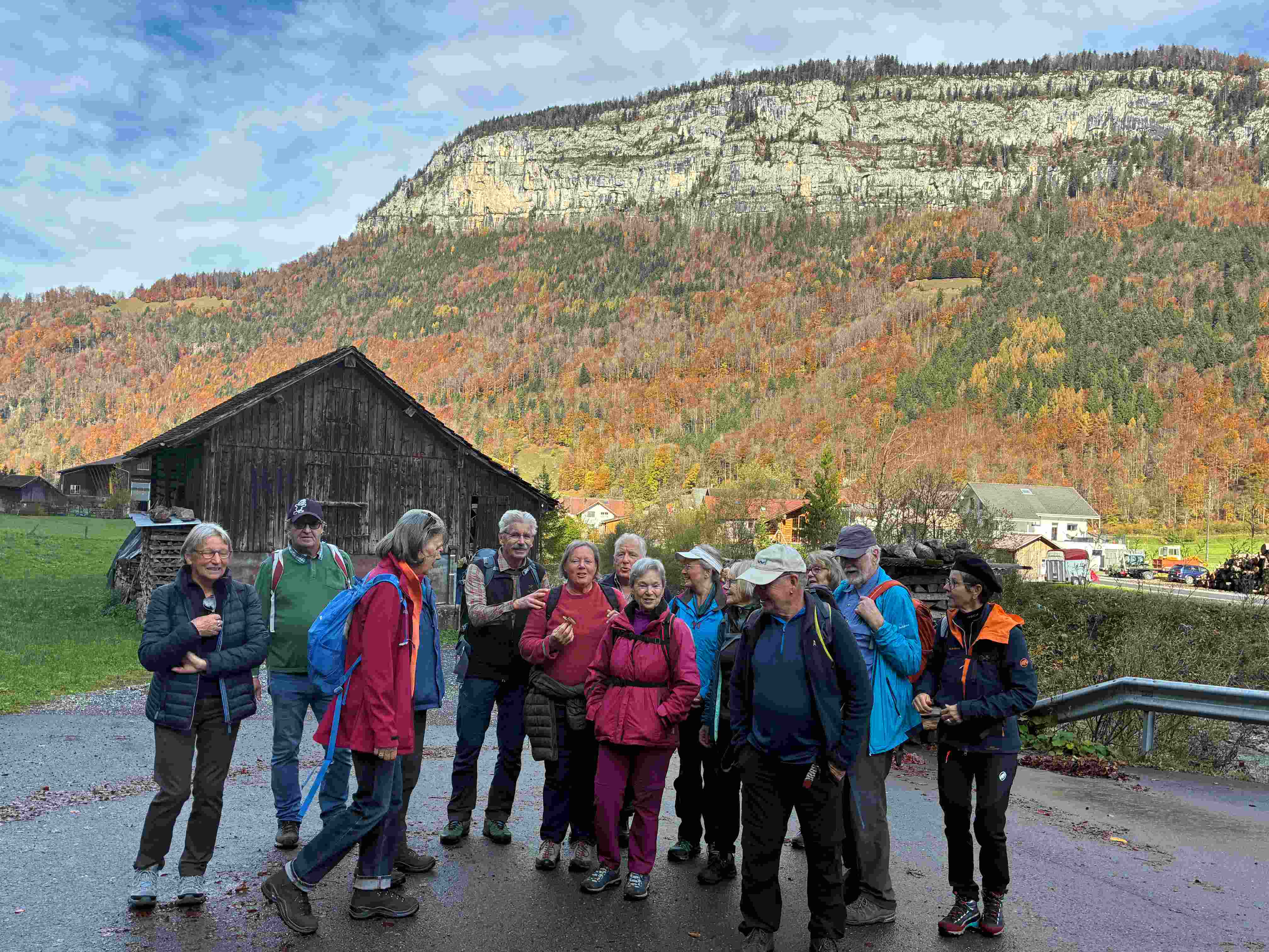 Der Wanderpfand zwischen Wohnquartier und Muota führte uns bald aufs offene Feld. Morgendliche Sonnenstrahlen erfreuten die Herzen, und wir zogen gemütlich westwärts. Die versprochene erste Rast musste mangels Sitzgelegenheiten stehend verbracht werden. Die farbigen Blätter an den Bäumen und das Laub am Boden machten uns Freude. Kleine Steigungen erfüllten die Vorgaben aus dem Profil der Herbstwanderung. Mit zunehmendem Tag gelangte die Sonne nicht mehr auf den Talboden, und der avisierte Picknick-Platz in den mit warmen Sonnenstrahlen beschienen Kalkfelsen war dann doch zu exponiert für unsere Gruppe. Nach der Stoosbahn und einem kleinen Abstecher auf der Hauptstrasse picknickten wir am Waldrand und auf kleinen Sitzgelegenheiten rund um eine einsam gelegene Scheune.