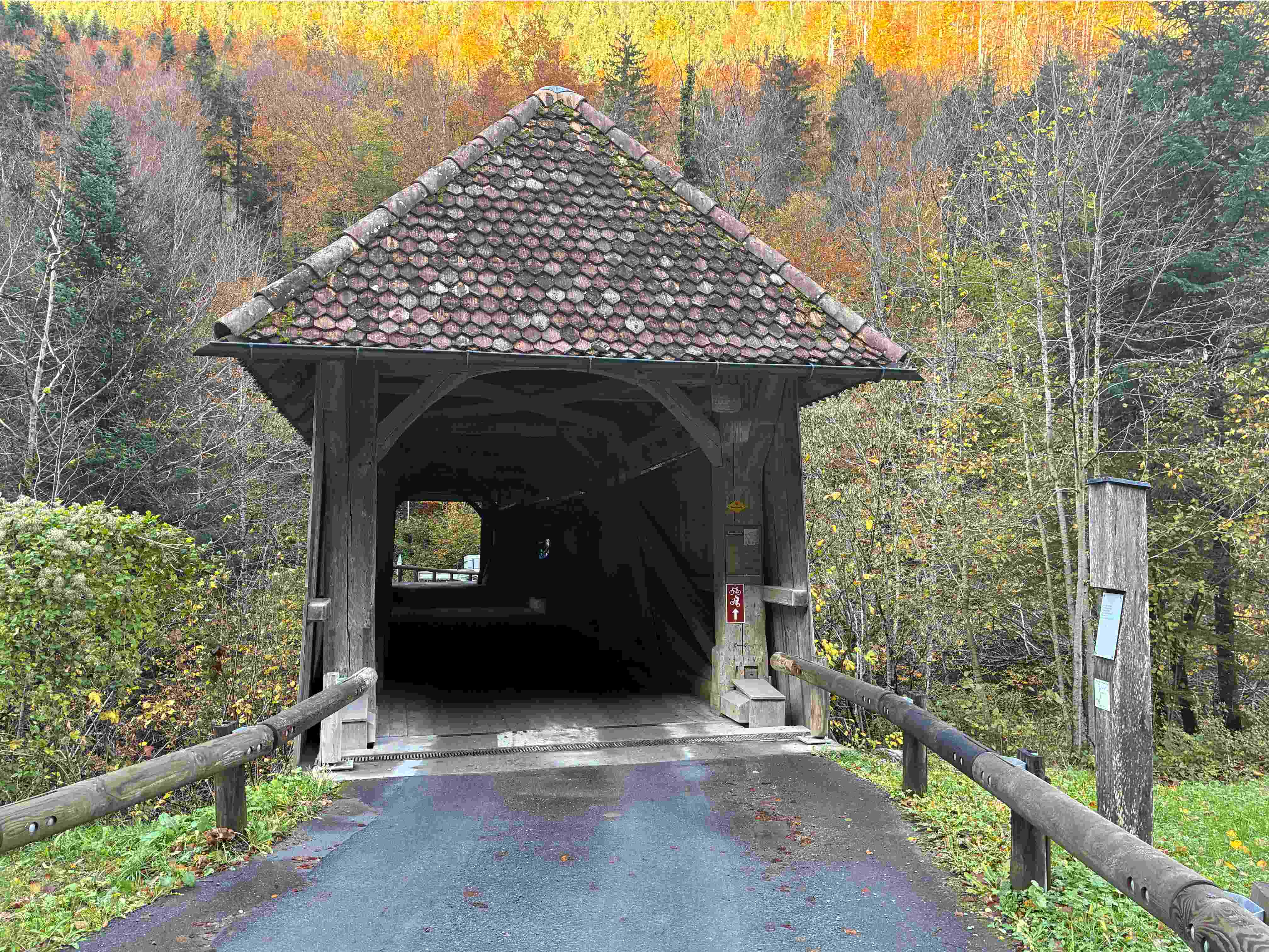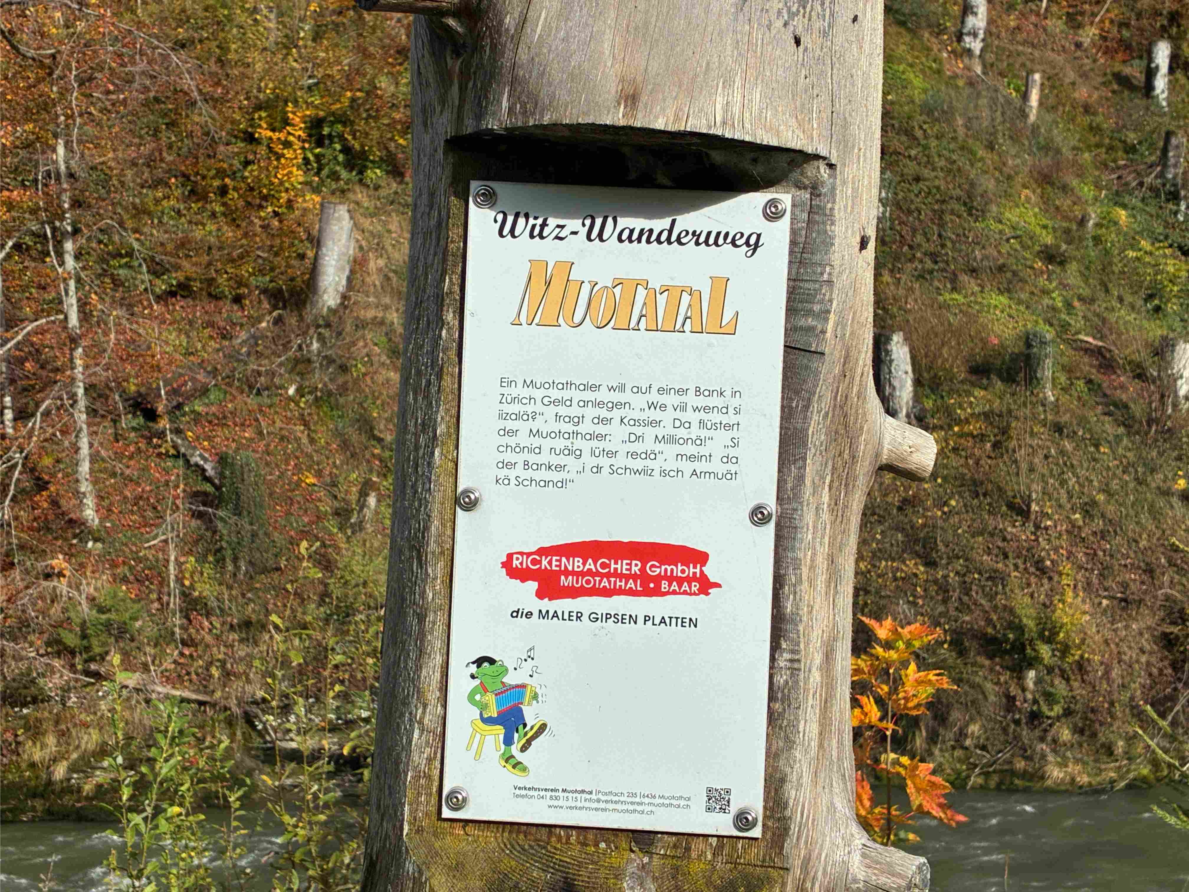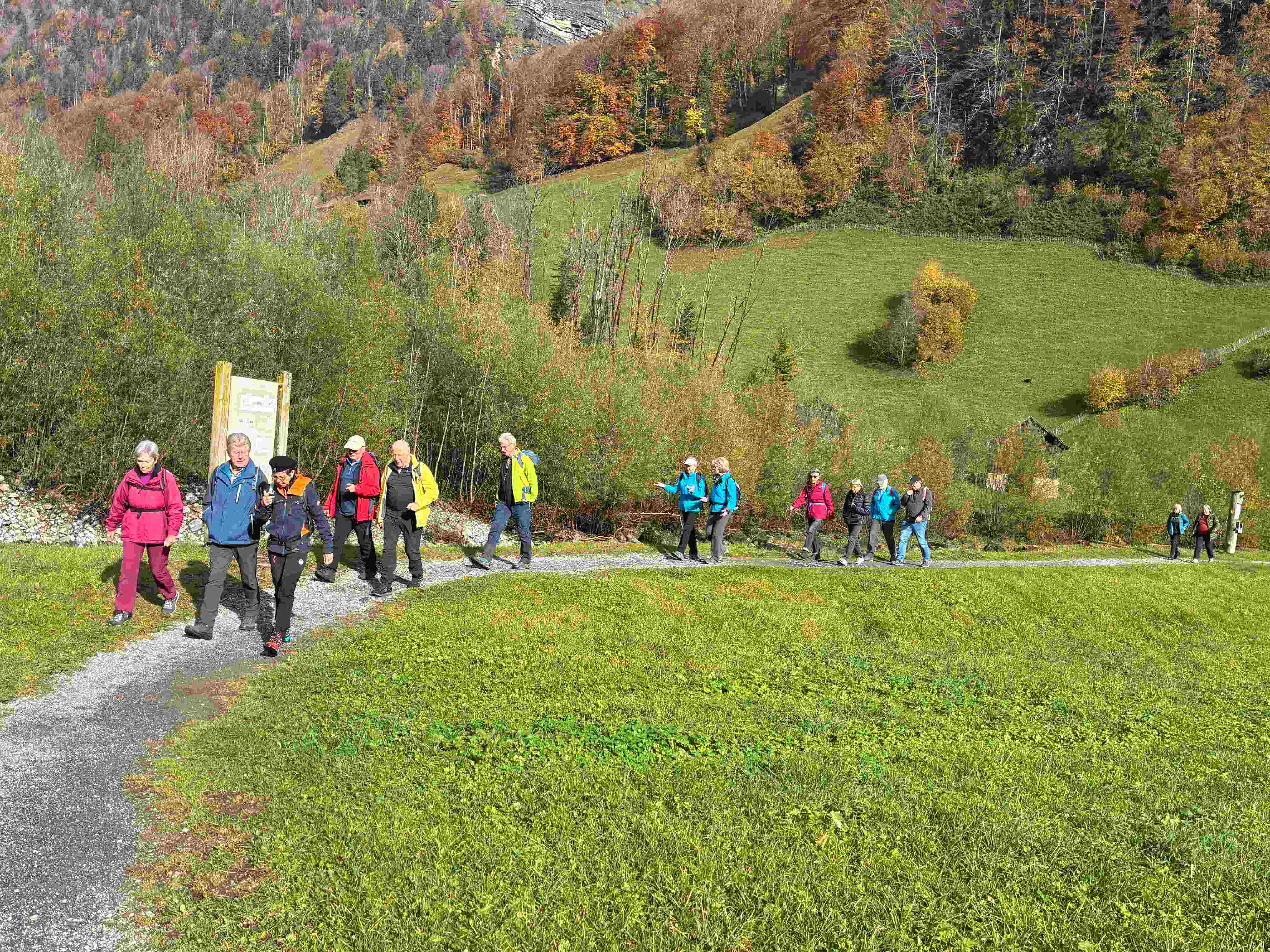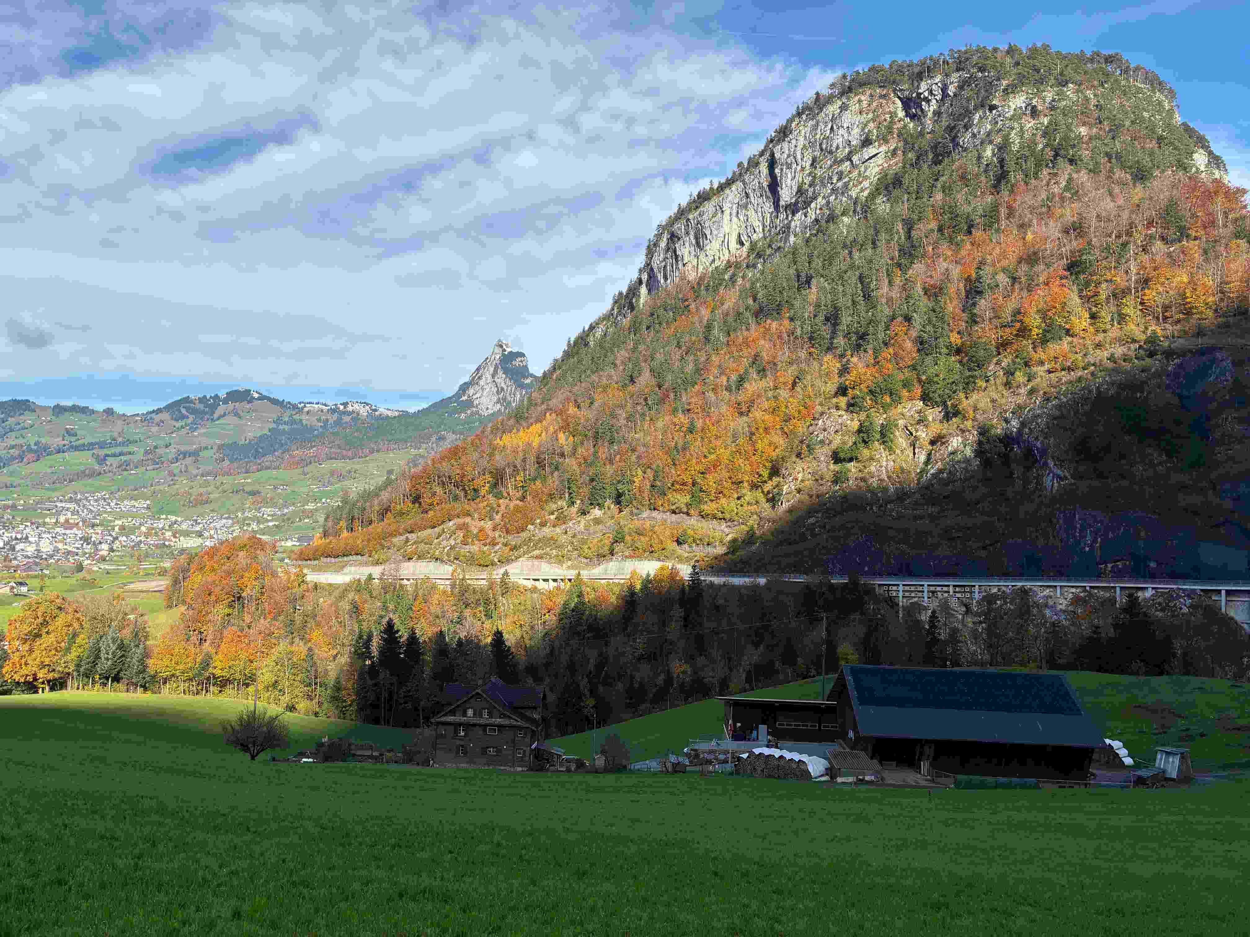 Der Wanderpfand zwischen Wohnquartier und Muota führte uns bald aufs offene Feld. Morgendliche Sonnenstrahlen erfreuten die Herzen, und wir zogen gemütlich westwärts. Die versprochene erste Rast musste mangels Sitzgelegenheiten stehend verbracht werden. Die farbigen Blätter an den Bäumen und das Laub am Boden machten uns Freude. Kleine Steigungen erfüllten die Vorgaben aus dem Profil der Herbstwanderung. Mit zunehmendem Tag gelangte die Sonne nicht mehr auf den Talboden, und der avisierte Picknick-Platz in den mit warmen Sonnenstrahlen beschienen Kalkfelsen war dann doch zu exponiert für unsere Gruppe. Nach der Stoosbahn und einem kleinen Abstecher auf der Hauptstrasse picknickten wir am Waldrand und auf kleinen Sitzgelegenheiten rund um eine einsam gelegene Scheune.