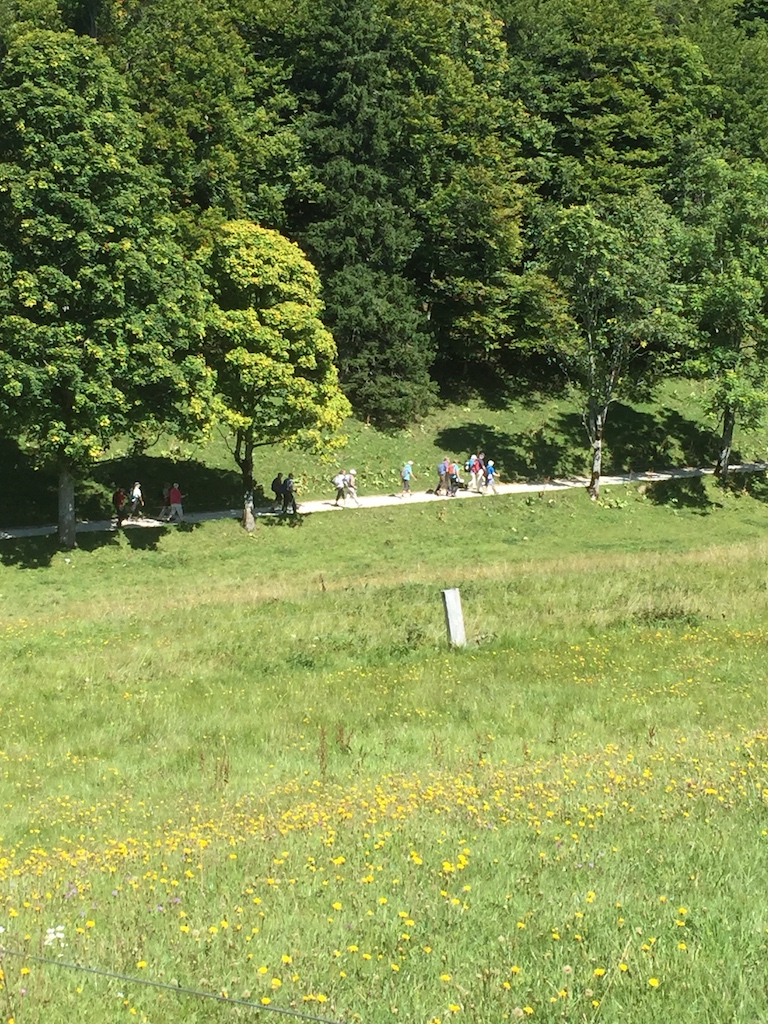 zur modernen Kabinenumlaufbahn. Oben angekommen gab es auf der Terrasse des Kurhauses bei bestem Wetter erst einmal einen Startkaffee. Dann begann unsere Rundwanderung unter der bewährten Leitung von Beatice Reichlin in Richtung Röti. Unterwegs konnten wir auf den Wiesen und Weiden viele Blumen bewundern, vor allem die Herbstzeitlosen und Silberdisteln in erstaunlichen Mengen. Auf dem 1395 m hohen Röte angekommen, bot sich uns ein grandioser Rundblick. Obwohl es etwas dunstig war, konnten wir das Mittelland, die Berner Alpen, den Passwang, die Aare, den Bieler See und vieles mehr sehen. Die Berner Alpen zeigten sich in einer ganz anderen Reihenfolge, als wir es von zuhause gewöhnt sind. Wieder abwärts ging es zu einem schattigen Mittagsrastplatz. Der Hammerweg führte uns durch einen schönen Buchenwald zum Hinterweissenstein. Da das Restaurant am Dienstag geschlossen hatte, verlegten wir unseren Schlusskaffee nach dem Rückweg auf die Terrasse des Kurhauses. Mit der Seilbahntalfahrt begann die Rückfahrt nach Hause.