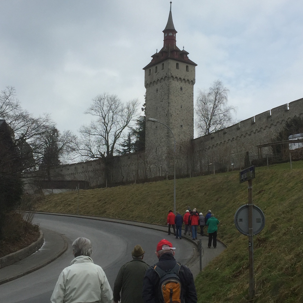 mit den zehn Türmen zum Ziel. Viele bekannte und unbekannte Details der Stadtgeschichte Luzerns erfuhren wir auf diesem Rundgang. Bereits im Metzgerrainle sahen wir, wie in einer engen Gasse Licht in die Räume eines Geschäftshauses reflektiert wird. Angefangen beim Nölliturm ging es hinauf, um die mittelalterliche Mauer mit dem Wehrgang und die Türme zu bewundern. Die geschichtlichen Hintergründe zum Bau der Mauer und zur Entstehung der einzelnen Türme, ergänzt mit überliefertem Wissen, waren für uns alle sehr interessant. Einzelne Frühlingsboten an den Hängen lassen schon eine schöne nächste Wanderung erahnen. Der Rückweg am Ufer des Vierwaldstättersees entlang beendete den erlebnisreichen Nachmittag. 6. März 2018